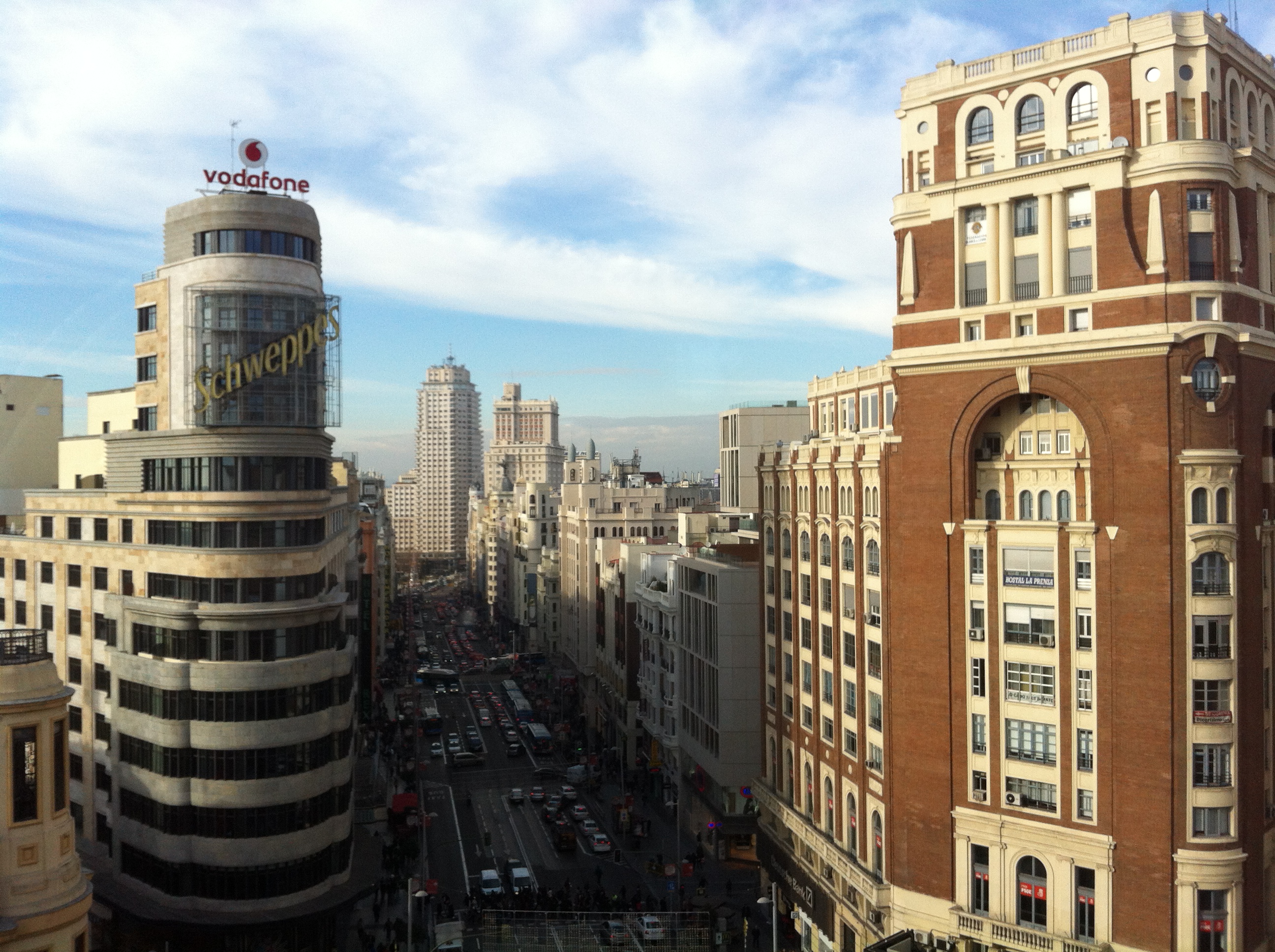 Es a la vez clásica y postmoderna, provinciana y neoyorquina, castiza y cosmopolita. Como Times Square, como Piccadilly Circus, la Gran Vía pertenece a esa clase de lugares que tienen la rara virtud de condensar en unos pocos metros cuadrados todas las esencias del mundo. Juan Cueto, que trabajó durante varios años en un despacho encaramado a una de las esquinas del edificio Madrid-París, me contó que disfrutaba mucho asomándose al balcón en los ratos libres para contemplar, desde lo alto, la inmensa corriente humana que electrizaba las aceras entre el cruce con Alcalá y la desembocadura en la plaza de España. Yo la recorrí por primera vez cuando apenas tenía veinte años y, cohibido como estaba por la grandiosidad de la urbe, repartía mi mirada entre el cielo y el suelo: desde las baldosas que confundían mis pisadas con las de los cientos de transeúntes que me salían al paso hasta las cúspides de aquellos edificios que eran, o eso me parecía a mí, los más altos que yo había visto nunca.