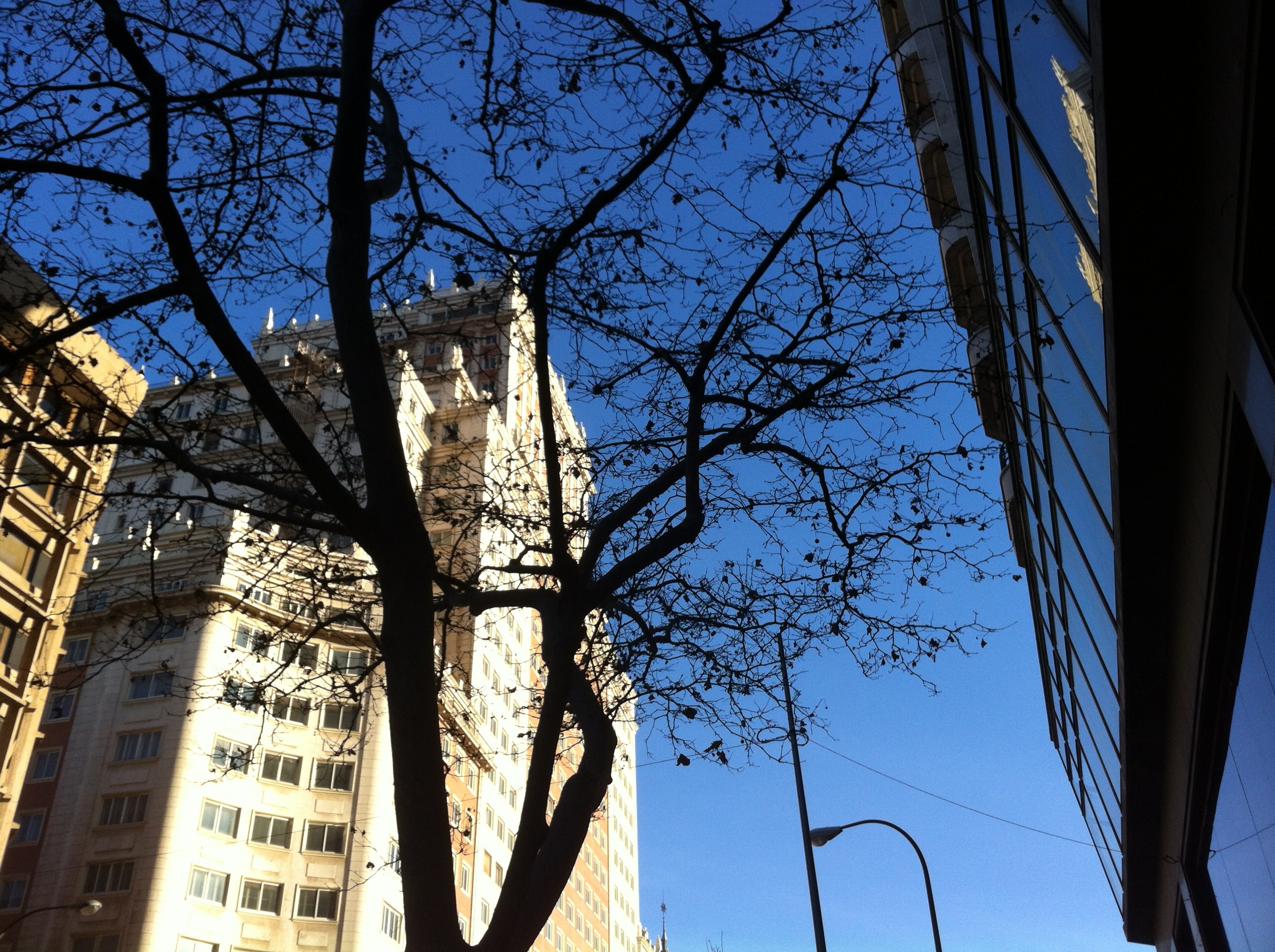 Hay cosas a las que las circunstancias despojan de su condición inicial para convertirlas en símbolos. El Edificio España, con sus 25 plantas y los 117 metros que median entre su base y su cúspide, es la octava construcción más alta de Madrid y fue uno de los primeros rascacielos que se erigieron en la ciudad. Empezó a levantarse en 1948 y se concluyó en 1953, y desde entonces su impresionante mole neobarroca observa impertérrita los atardeceres sobre la Casa de Campo y da una intimidatoria bienvenida a los viajeros que llegan a la capital desde las carreteras norteñas. Así me recibió a mí en mi primer viaje a Madrid, cuando con apenas veinte años desemboqué en la urbe para ver si ella me dejaba iniciarme en sus misterios, y así me gusta evocarlo siempre que lo tengo delante, con el porte majestuoso que le confieren su alzado y su veteranía. Con esa armonía tan apabullante, y sin embargo tan delicada, que orienta el diálogo que desde hace décadas viene manteniendo con su vecina Torre de Madrid.