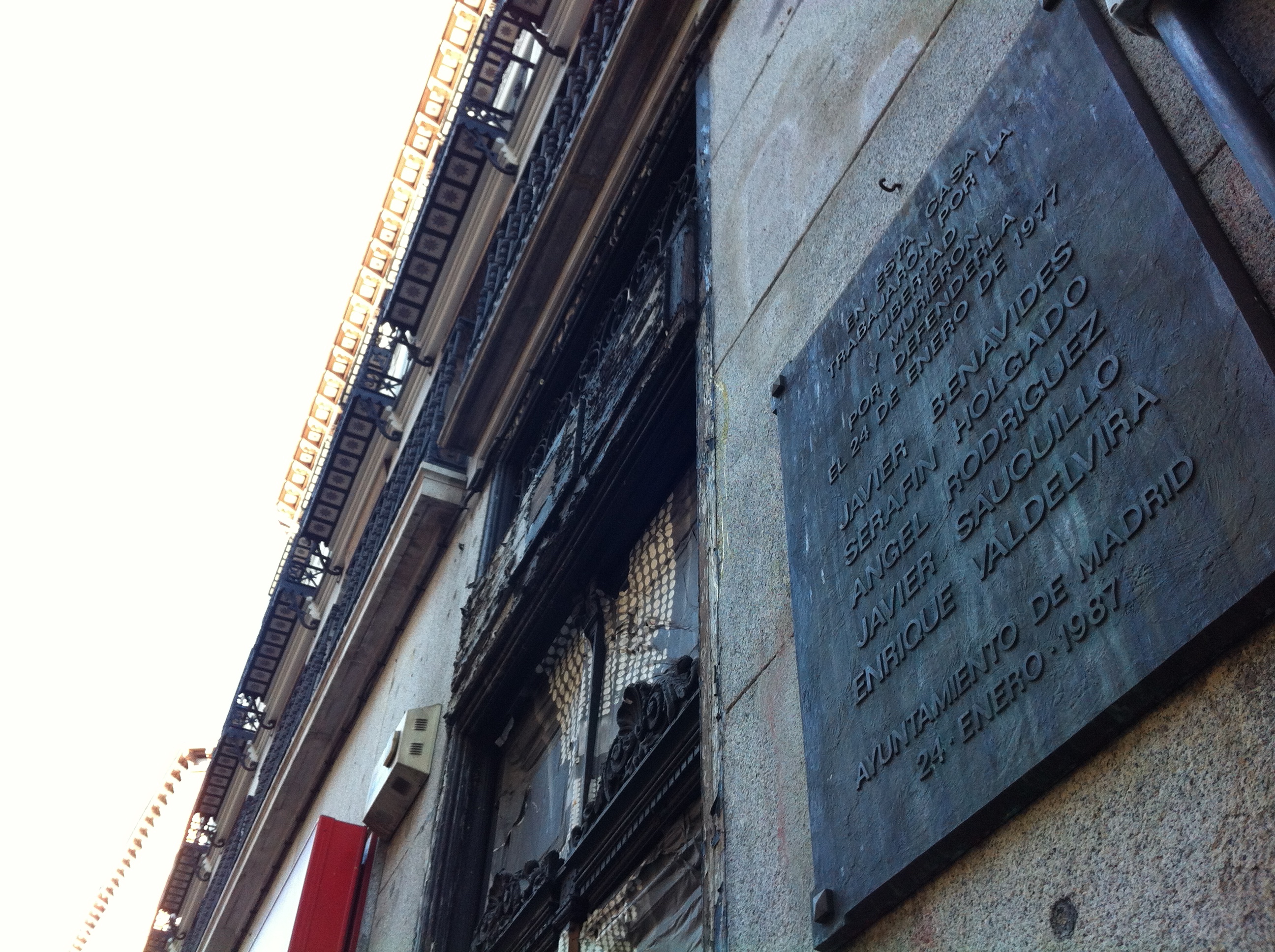 Vi la placa por casualidad hace unos meses, mientras descendíamos la calle de Atocha en busca del Museo del Prado. Aunque está donde ocurrió todo, junto al portal número 55, los encargados de instalarla la pusieron a cierta altura, y supongo que eso hace que pase inadvertida para la mayoría de quienes, ajenos a onomásticas y evocaciones históricas, transitan por las aceras madrileñas sin otra vocación que la de perseverar en sus quehaceres diarios. La inscripción recoge los nombres de las víctimas —Enrique Valdevira Ibáñez, Luis Javier Benavides Orgaz, Francisco Javier Sauquillo Pérez del Arco, Serafín Holgado y Ángel Rodríguez Leal— junto con un breve resumen de los trágicos acontecimientos que, pese a haber sido suficientemente relatados, cada vez se van enterrando más y más en el olvido. En el tercer piso de ese inmueble, hubo en 1977 un despacho de abogados laboralistas. La noche del 24 de enero de ese año entraron en él dos pistoleros de extrema derecha y dispararon a todos los que encontraron dentro: fallecieron cinco personas, aquéllas cuyos nombres ocupan la placa, y resultaron heridas otras cuatro.